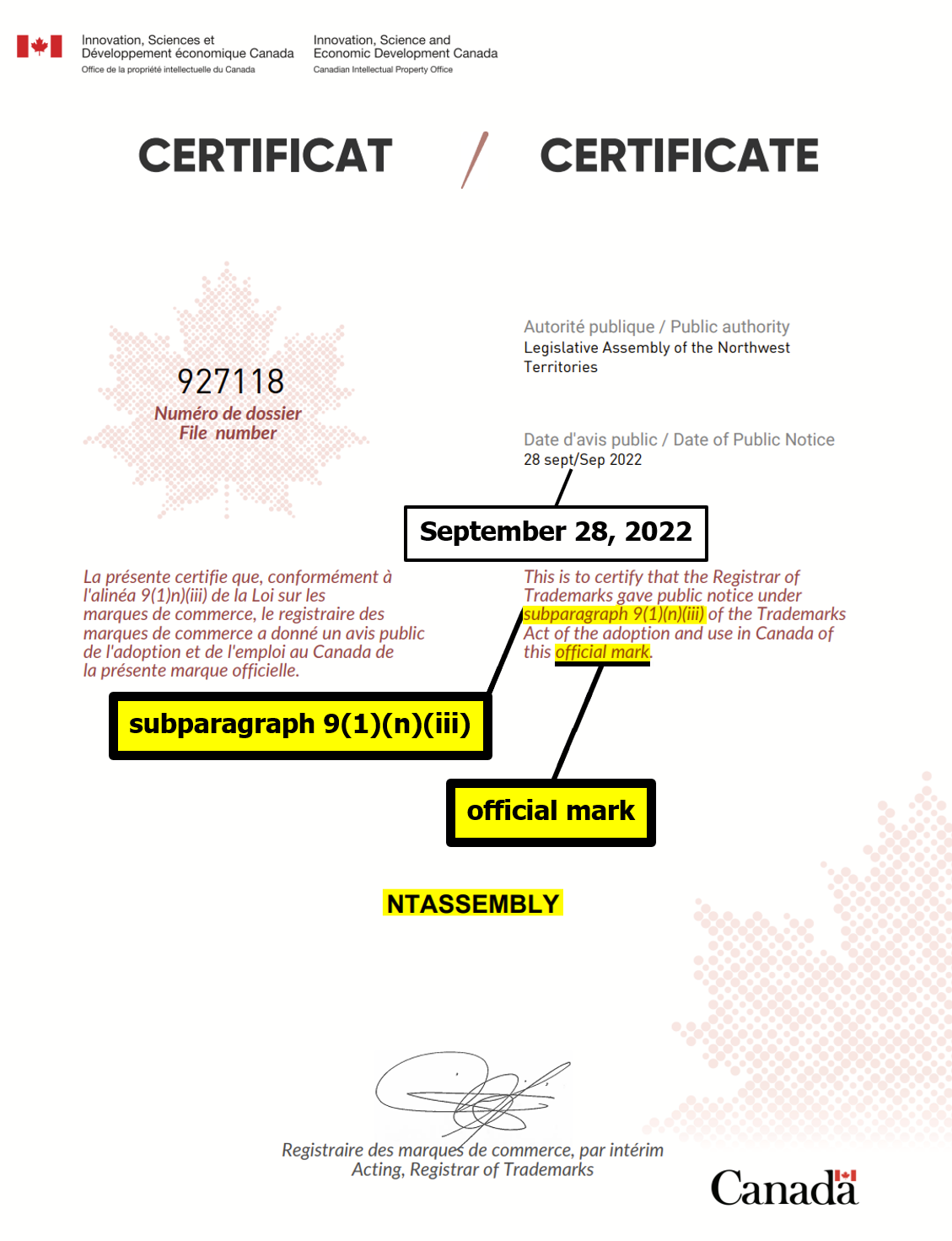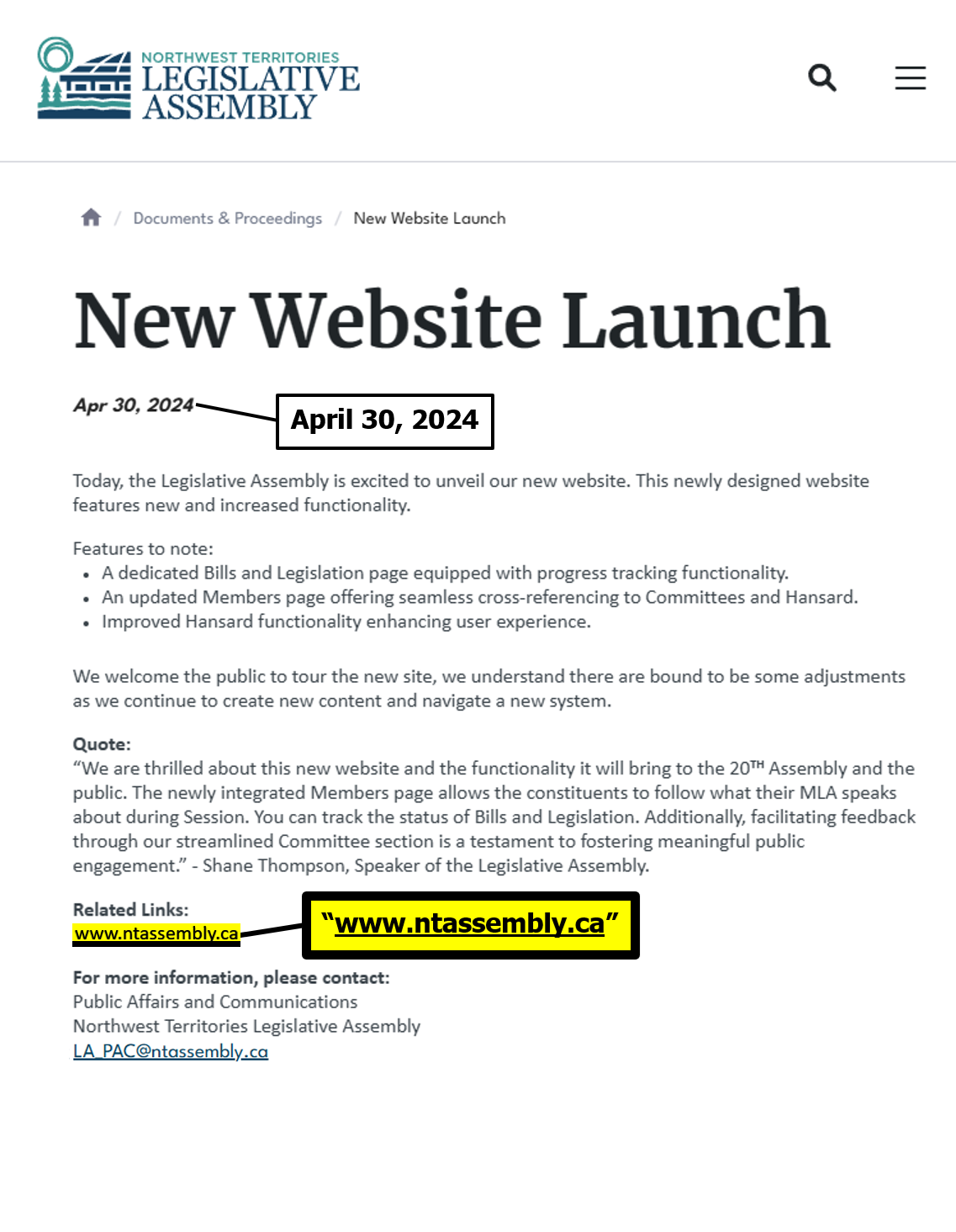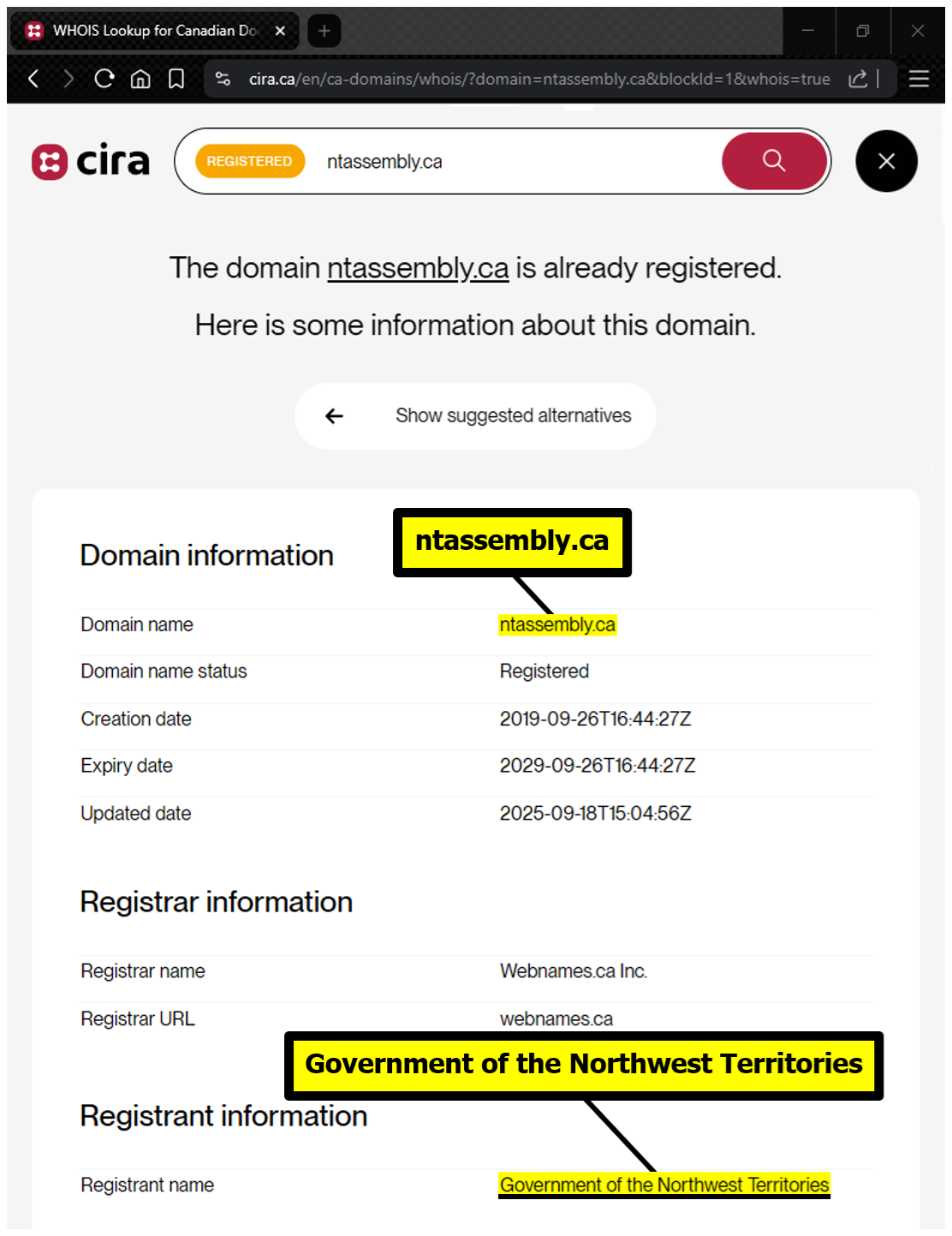 "the NTLA owns the domain name www.ntassembly.ca" is FALSE: